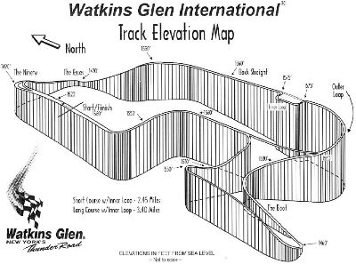 There is a 115 foot drop in elevation from the "bus stop," which is the little dent in the long, back straight, to the "toe of the boot" in the bottom right corner. We did the long course which was 3.4 miles.