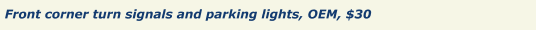 Prices below do not include shipping. I like to use UPS or USPS Parcel Post when there is no rush. I provide tracking numbers. My zip code is 17028. For really bulky items, e.g. body panels, exhaust, etc., Greyhound is about one-third the cost of UPS. The buyer has to go the bus station to pick up the item, which Greyhound will hold. Buyer does not have to meet the bus when it arrives.