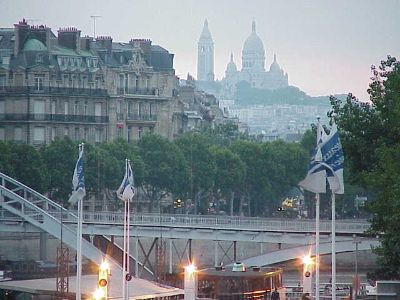 View up the Seine River, Basilique du Sacré-Coeur in the background.