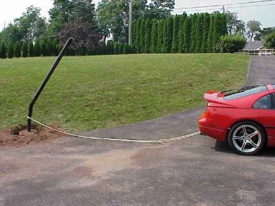 I wanted to get rid of this eyesore, an old bent basketball pole next to the garage entrance. Although I generally do not recommend using a Z car like this, alls I know is that the car can pull a lot harder than I can alone. I did not own my truck yet.