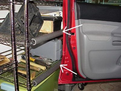 This easily slipped over the edges of the shelves in the picture, and stayed in place without any adhesive or ties. Now the paint on the door edge of my new truck will not get chipped on the metal shelves in my garage.