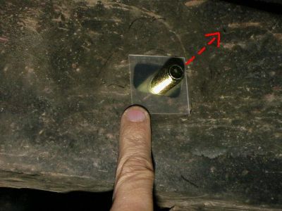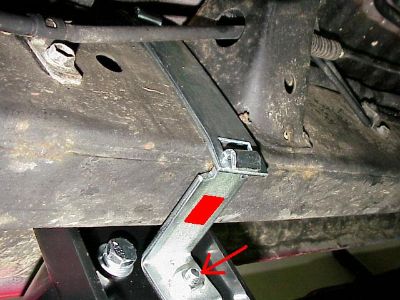 The arrow shows the orientation of the long arm of the front mount tab assembly after it was inserted behind the frame rail.