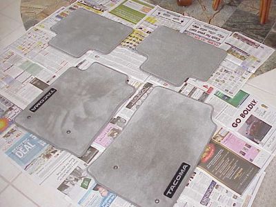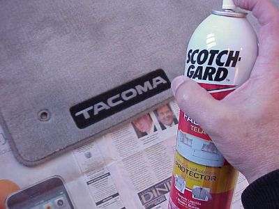 Remove mats from truck. Clean with Dri-Clean and damp sponge or soft brush. Let dry. Apply Scotch Guard in several light coats. Stains will not stick after that. I will also Scotch Gard the interior cloth seats once the temperature gets above freezing (eleven degrees F today). Shield and cover the non-cloth, plastic interior parts from the overspray.