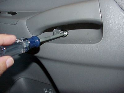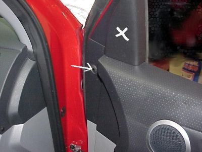 Put window down. Easily pry off the inside triangular trim cover marked with white X. All I needed to use for that was my fingers. Remove the round plastic fastener next to the arrow by first pressing in on the center plunger, then pry loose.