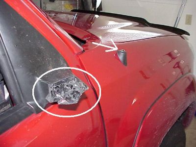 Circle shows where the tree branch violently snapped off my folding power mirror. The antenna mast was a simple, non-powered straight rod.