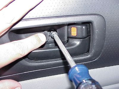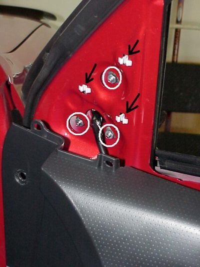 Once all the prawls are loose, lift the door which is "hanging" by the top edge along the window sill. Since I was only trying to access the three bolts that held on the passenger mirror, I did not bother to disconnect the power window switch and completely remove the door panel. For the record, the power window switch garnish easily pries loose from its front edge.