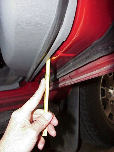 Insert a plastic pry tool about two inches into and along the bottom edge of the door, between the interior plastic door panel and the metal door frame. Slide along the edge until you hit a clip, then gently pry loose.