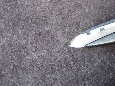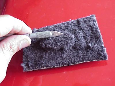 I felt I could make the patch look even better by using a matching donar piece of carpet from under the seat. So the next time I had my seats out of the car, I cut a small patch from the original carpet that will never show. A car's interior is a dark and shadowy place, and no one has ever noticed. This repair is almost invisible.