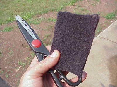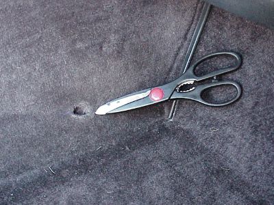 That's my beard trimmer, lol. Small detail scissors can be used instead but a new electric clipper is only about twenty bucks. I "plateaued" the patch as shown. here. Then it will fill and blend in perfectly with the edges of the hole, from behind.