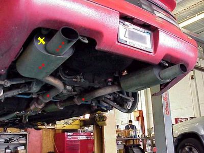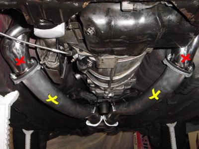 Here is from the front of the car, looking toward the rear. The shiny 3" downpipes with red X's and partially hidden, and bolted to the 3" midpipes with the yellow X's.