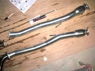 I am now running these 3" aftermarket midpipes with short high flow cats that will not pass an emissions sniffer test, but will pass a visual. The cats are the bulges in the pipes.