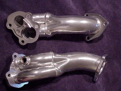 Here are the 4-bolt downpipes that originally replaced my pre-cats. Just by looking at them it's easy to see how the exhaust flow would be improved. These downpipes are "divorced" style, meaning there are two separate openings at the end that bolts onto the turbo charger. The smaller hole is for the turbocharger wastegate, the larger hole is for the exhaust. That's right, the exhaust for each half the engine has to fit through a hole roughly the the size of a half-dollar