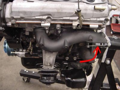 Here is the driver side exhaust manifold, installed. The turbocharger will bolt onto the end of the manifold at the red arrow. Then the downpipe will bolt onto the turbocharger.