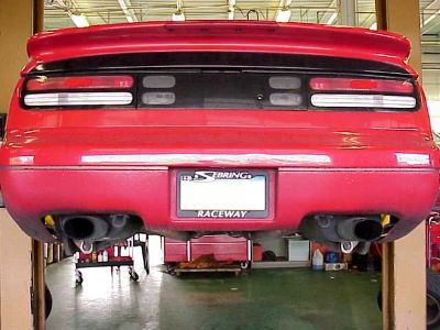 There are several different sections to the exhaust on a z32 twin turbo, all of which can be purchased separately. The first part of the exhaust that should be upgraded is everything downstream from the stock catalytic converters or main "cats." This part of the exhaust includes the mufflers and is called a "cat-back" exhaust, meaning everything that comes after the catalytic converters. A high flow, 2 1/2 inch, stainless steel cat-back exhaust lets the engine breath enough for virtually all bolt-on engine modifications, and is good enough for up to 650 RWHP. Small incremental gains can be made with a three inch cat-back above 650 HP, but the "dollar per horsepower" cost is very high.
