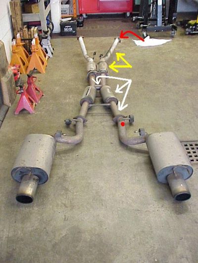 Here is a diagram of my aftermarket exhaust, with all the sections explained below. The rear of the car is closest in the pic.