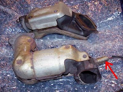 Below are the stock pre-cats. They look very clunky. Pre-cats have right angle bends that are not conducive to good exhaust flow. The red arrow is pointing at the oxygen sensor. Each pre-cat has one oxygen sensor. I already removed the oxygen sensor from the top pre-cat.