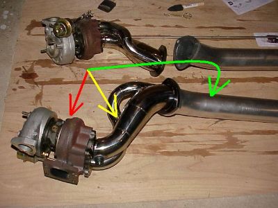 Here is a pic showing the relationship between the turbocharger (red), downpipe (yellow) and midpipe (green).