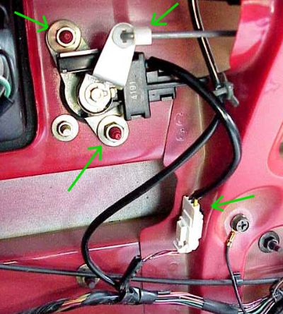 2. You can now see the lock. Green arrows point to the four connections. Undo the two 10mm nuts. Gently rotate and pry off the white, plastic retaining clip connected to the metal rod. Disconnect the electrical connection. Pull the lock out. Your hatch will still close and function using the release next to the driver’s seat, even with the lock removed.