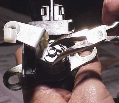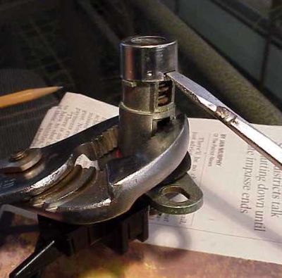 6. Now you can push on that end of the tumbler assembly such that it will slide forward inside its housing a quarter inch or so. The reason this is important is that it allows you to gain access to the first tumbler at the opposite end, closest to where the key enters, and it loosens up the tumbler assembly in general. The pic shows pressure being applied with my thumb so I can work the first tumbler at the opposite end.