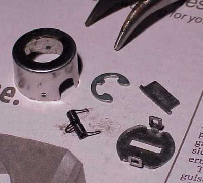 4. Once the cap is off, you will see a flat metal bracket over the end of the lock that is snapped into place on two sides. Pry this off and be ready for the two small parts underneath it to fall out. They are the small metal flap that closes the keyhole, and the spring that works it. Set these small parts aside. The pic also shows the C-clamp described below.