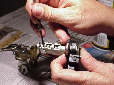 8. Now test the lock with your key. It should turn. Keep cleaning and oiling it until it does, because if it doesn’t turn now, it won’t turn when you put it back together. My lock turned on the third or fourth try. With the tumbler assembly turned, put more oil on the new, exposed parts. I finished up with a light coat of lithium grease on the tumblers, including putting some grease on the key and using it in the lock a few times.