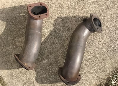 Notice the turbo flange has five bolt holes. These DP's would not fit stock turbos which are four-bolt. These DP's were wrapped in exhaust tape which left some rough marks on the surface.