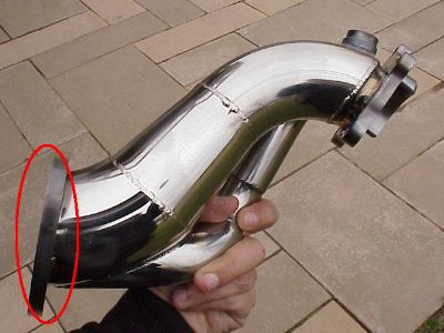 Notice the right angle bends. Not good for exhaust flow. Stock pre-cats can be "gutted." The ceramic brick and catalytic material inside the pre-cats can broken up, pushed, prodded and pulled out. I've heard the tool of choice is a broomstick. This is a lot cheaper than buying downpipes, but is considered a ghetto mod with not near the same improvement in performance as a pair of high quality, smooth downpipes. Aftermarket downpipes smooth out the right angle bends and get rid of the restrictive catalytic brick material inside.