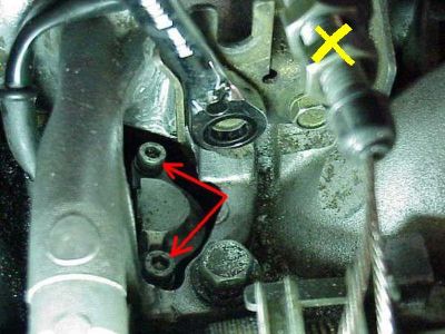 For injector number one, loosen and set aside the throttle and cruise control cables (yellow X). The Gear wrench is on one of the two bolts holding the throttle bracket.