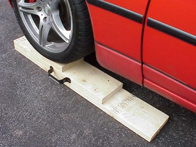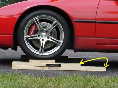 Build two of these ramps using 2 X 8's. I quickly learned that when it comes to lumber, two inches really meant 1 1/2 inches actual thickness. Only in America. So the total lift for the three boards as shown is only 4 1/2 inches, but that makes the difference in being able to get a jack under the front center of the car.