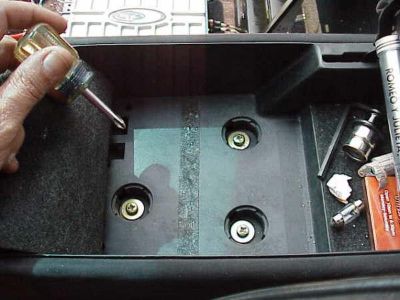 Open the lid on the ashtray. Lift ashtray out. Remove one screw in corner under ashtray, shown by the red dot below.