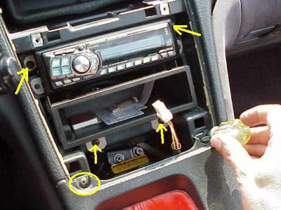 After the four screws above are removed, the center bezel holding the air vents and surrounding the stereo head unit can be pried out. There are a couple of prawl clips on the sides near the bottom of the bezel.
