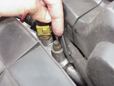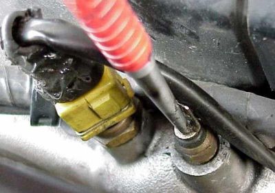 Remove the black engine harness connector to the temperature gauge sensor and wiggle the spade connector with a finger tip as shown.