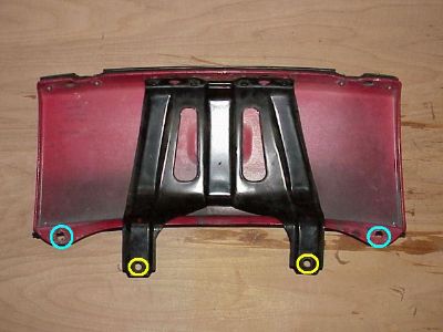 To remove the NP, open the hood. The only bolts that need to be removed are shown above, circled in blue, and yellow if a metal bracket is present. The front (top) of the metal bracket is bolted to the NP, but not to the car. After the bolts are removed, the NP should easily lift up, back and out of the car.