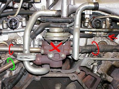The red X is on the EGR unit. The red circles are around the metal tubes that are also part of the EGR system. These tubes wrap around the block and return exhaust gas to to the intake plenum.