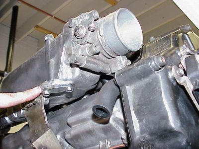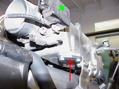 The next pic is in the back, center of the engine, with the engine out of the car. The EGR solenoid was connected by vacuum tubing to the nipple at the red arrow on the right side of the picture shown below.