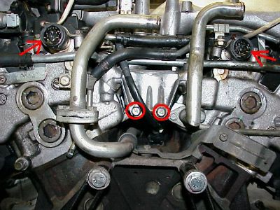 The circles show the 12 mm mounting bolts left in place after the EGR was removed. The arrows show the VTC solenoids, not germane to this discussion. The EGR metal tubes are gone, too.