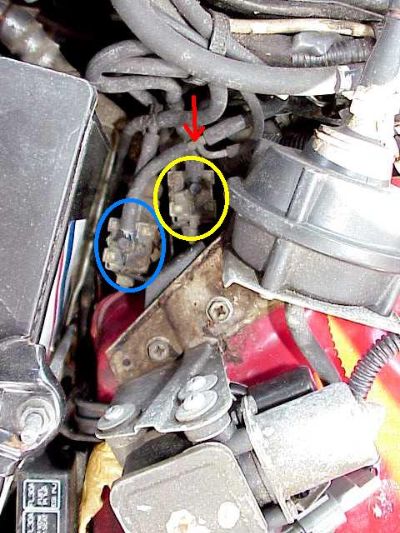 Here is the EGR solenoid circled in yellow, on the passenger side, in between the battery on the left, and the cruise control actuator on the right. The EGR solenoid is in front of an identical solenoid circled in blue, which is the AIV solenoid. The EGR solenoid is connected to the EGR in the back of the engine by a vacuum line.