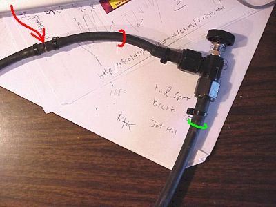This brass fitting came already spliced into the MBC's wastegate line. The arrow points to a small hole open to atmosphere.