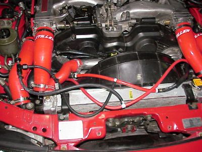 In the above pic, the fan shroud is to the left, and the radiator cap can be seen peeking up at the bottom middle edge. There is a passenger side wastegate hose also. I had to remove both red intercooler hoses on the passenger side to access the wastegate hose. My red hoses are aftermarket. The stock boost hoses were black with insulating sleeves.