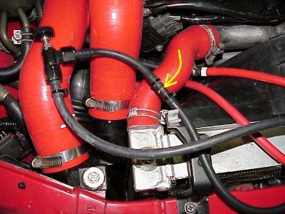 This is the passenger side wastegate hose connected to the black intercooler hardpipe. The large, inner, bright red silicone intercooler hose has been removed for access.