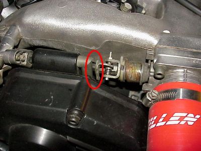 This is a fairly commonly reported problem. The throttle will stick, usually after cruising in fourth or fifth gear. The sticking point is shown here, under the hood, part of the throttle body linkage.