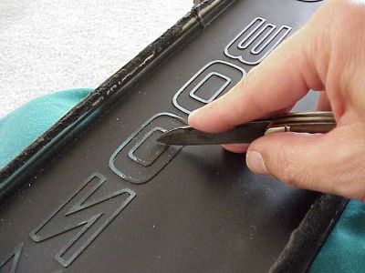 I used the excellent FAQ from TT.net on "How do I make the 300ZX on the rear panel glow?" as my guide. This is essentially the same process except instead of making the logo glow, I am trying to eliminate it. From the FAQ, note that the four brads along the top edge of the panel are threaded. Turning them CCW helps in their removal. The brads can also be pried out with a pen knife.