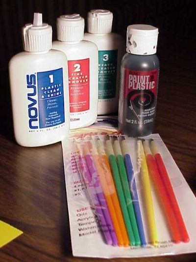 The type of paint used was a huge issue. For some strange reason, paint does not want to adhere to the bare plastic on the logo. I tried three different kinds of black spray paint and they either wouldn't stick, or they would start to "crackle" after repeated coats. The black paint I ended up using that worked was called "Plaid Paint For Plastic." I bought it at a Michael's, an arts and crafts mega-store chain. The paint was very thick and goopy. I prepped the plastic with alcohol as per the instructions on the paint bottle. I applied five or six coats with a small brush before the paint was opaque enough. The paint was a water-soluble acrylic and cost $2. A pack of cheap brushes was $1. The pic also shows the Novus system I used for three step removal of scratches on the outside surface of the panel, which I recommend.