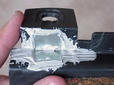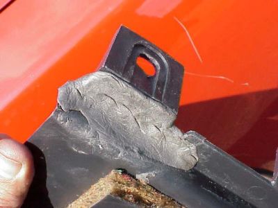 Anywho, I super-glued the bracket back in place. Super glue alone is not enough, but I did this in order to hold the piece in place for this next step. The red line shows where the piece was originally snapped off.