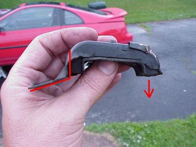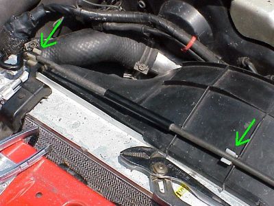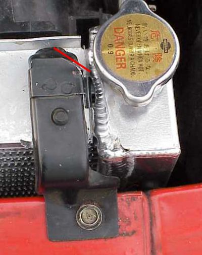 Notch the driver side of the radiator as well. The arm holding the white clip must be cut off or it will run into the radiator cap. The cut is shown by the red line. Save the little plastic clip that was on the arm or order a new one for two bucks.