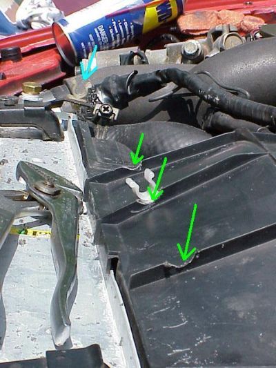 The green arrows show the ridges ground down for the strut bar channel. The new plastic clip is next to the middle green arrow. The blue arrow points to the strut clamp on the passenger side radiator bracket.