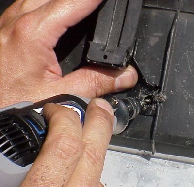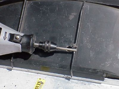 I still wanted to use two clamps to hold down my hood strut bar, not just the one left on the passenger side. I decided to mount a second plastic clamp on the radiator shroud. I marked the shroud where I wanted to put the clip based on how the hood strut bar lay. Then I Dremel'd the right size and shape hole using one of the radiator brackets as a template. Make the hole a little on the small side since the fan shroud is made of plastic, and not rigid metal like the bracket.