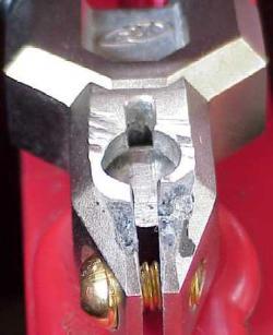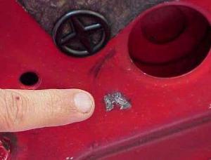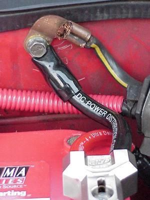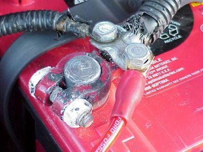 The battery may sit too high on top of this tray.  I had clearance "issues" with the positive battery cable terminal hitting the underside of the hood.  Read as - sparks, car shutting down, fire hazard, metal arc-welding itself, NOT GOOD!  Here is a close-up of the positive terminal end AFTER I cleaned it up and filed it open from welding itself shut solid across the gap at the tips.  You can even make out the shape of the terminal tip at the contact point under the hood.  ZZAAAPP!