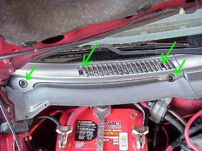 You have to remove the smaller, passenger side windshield cowling in order to remove the stock battery. The cowling is held in place by four plastic fasteners, two round ones and two square ones.  You gently back the screws out and pry the clips up.