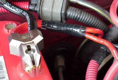 At the negative terminal, I combined my two, red eight gauge, earthing cables into one, four gauge cable, using a butt connector.